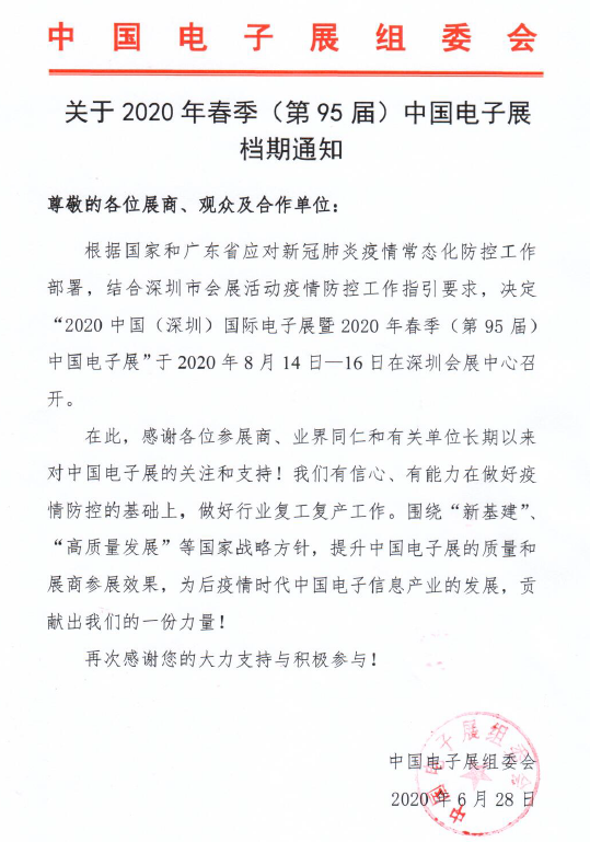 根據國家和廣東省應對新冠肺炎疫情常態化防控工作部署,結合深圳市會展活動疫情防控工作指引要求,在會商有關部門和部分企業的基礎,上,決定“2020中國(深圳)國際電子展暨2020年春季(第95屆)中國電子展”于2020年8月14日一16日在深圳會展中心召開。在此,感謝各位參展商、業界同仁和有關單位長期以來對中國電子展的關注和支持!我們有信心、有能力在做好疫情防控的基礎上,做好行業復工復產工作。圍繞“新基建”“高質量發展”等國家戰略方針,提升中國電子展的質量和展商參展效果,為后疫情時代中國電子信息產業的發展,貢獻出我們的一份力量!